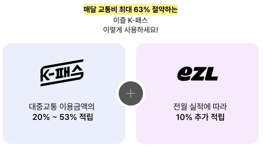 - 이즐 K-패스 추가 적립: 전월 이즐 K-패스 카드 이용 금액(교통, 유통, 온라인 등)이 20만 원 이상일 경우, 대중교통 이용 금액의 10%를 추가로 적립받을 수 있으며, 최대 적립금은 2,000원입니다.